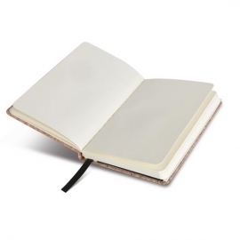 Blocco per appunti con copertina in sughero, interno da 98 fogli, cordino segnalibro, chiusura con elastico, tasca interna.