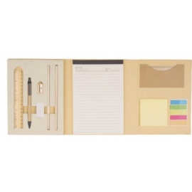 Set appunti in cartone riciclato con blocco appunti con 40 fogli meno f.to A4 a righe, segnalibri adesivi, riga in plastica da10 cm., due matite in legno, penna a sfera in carta riciclata e plastica, temperamatite in legno, gomma, righello in legno da 15 cm. con scala in centimetri e inch. . Formato 15x21x2,6