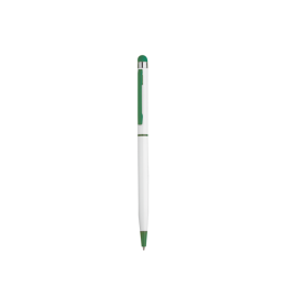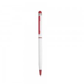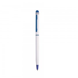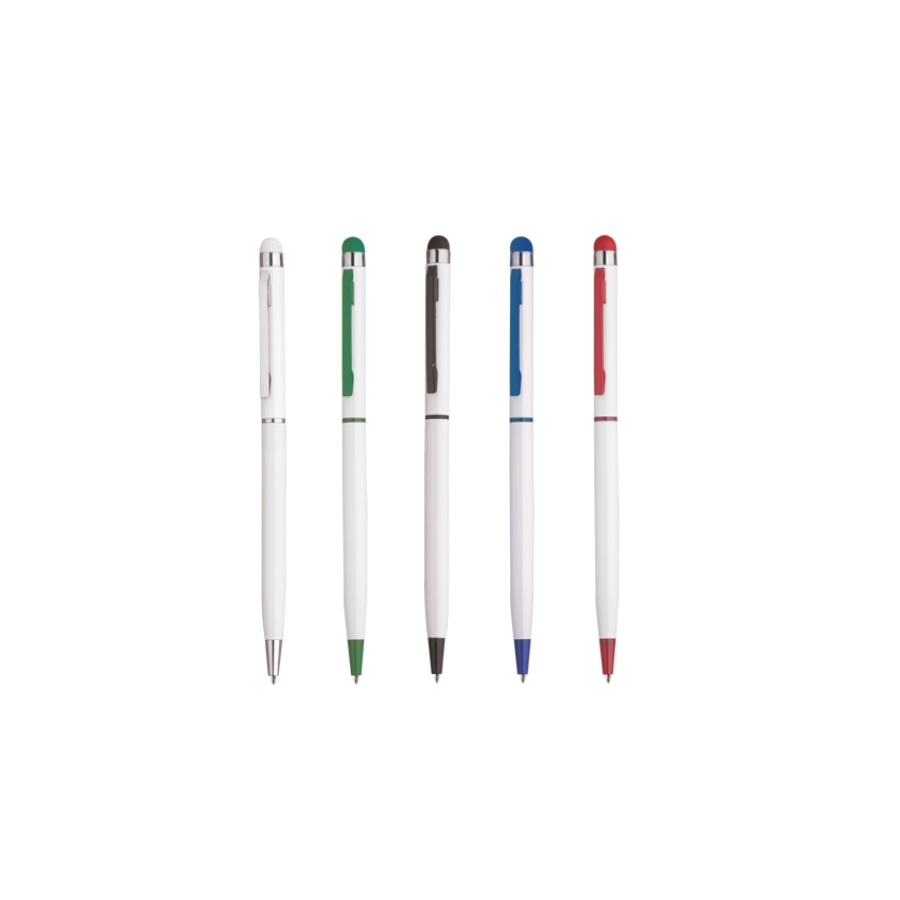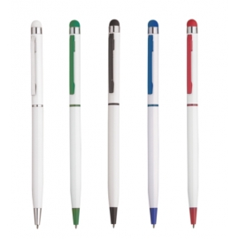 Penna a sfera in alluminio apertura e chiusura a rotazione,fusto bianco,particolari colorati,gommino touch screen, inchiostro nero.