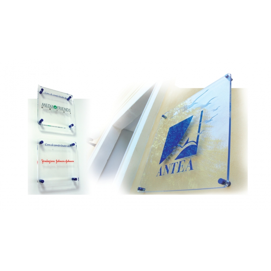 TARGA IN PLEXIGLAS TRASPARENTE, CON ANGOLO A 90° O ARROTONDATO, 3 SPESSORI A SCELTA. DISPONIBILE IN TRE GRANDEZZE, COMPRESA STAMPA A COLORI PER ESTERNO.
